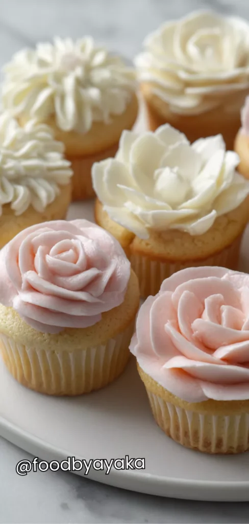 Make sure your cupcakes are completely cooled before decorating. Use frosting at room temperature with medium-soft consistency. Pipe gently and steadily, and avoid touching the petals until fully set.