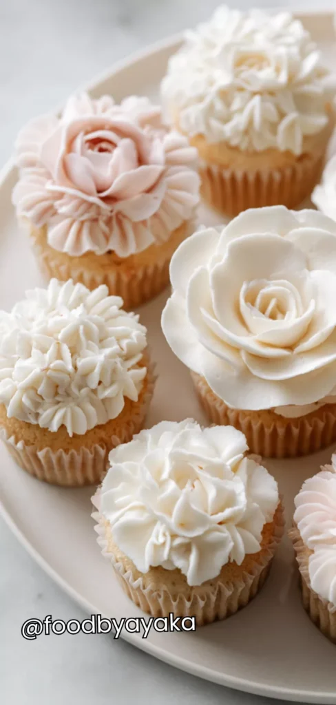 - Serve and enjoy: Arrange the cupcakes on a platter for display. For added effect, you can dust lightly with edible glitter or sprinkle tiny sugar pearls in the center of the flowers. Serve at room temperature and enjoy the stunning, floral presentation that’s perfect for parties, spring events, or a festive treat.