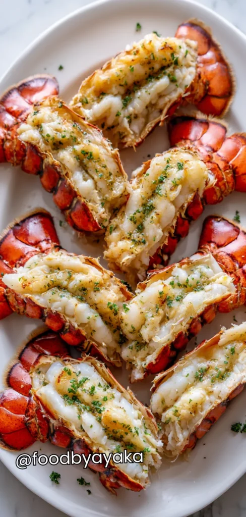 I like to serve these lobster tails on a simple warm plate because the dish naturally looks elegant without needing too much decoration. When I drizzle the leftover garlic butter over the top, it gives the lobster a glossy finish that looks beautiful and inviting. A few lemon wedges around the sides make everything look fresh and bright.