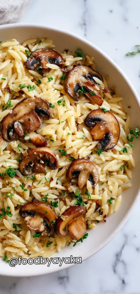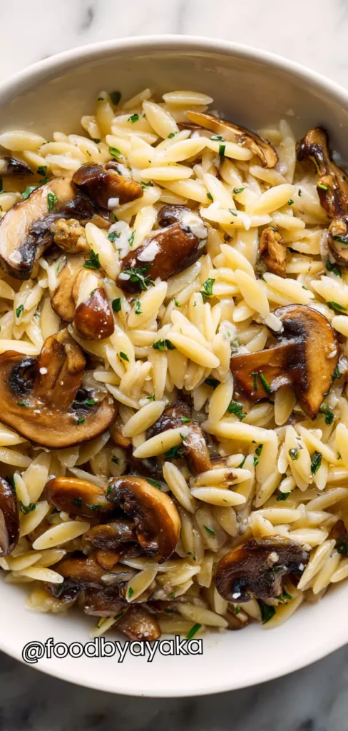 I have tried many pasta recipes, but this one is special because it comes together quickly and requires minimal ingredients. I use fresh mushrooms whenever possible, because they have more flavor and a better texture than canned. Always make sure your garlic is finely minced, as it really brings out that warm, aromatic base. I also prefer using a little broth instead of just water, which makes the orzo taste rich and buttery without being too heavy.
