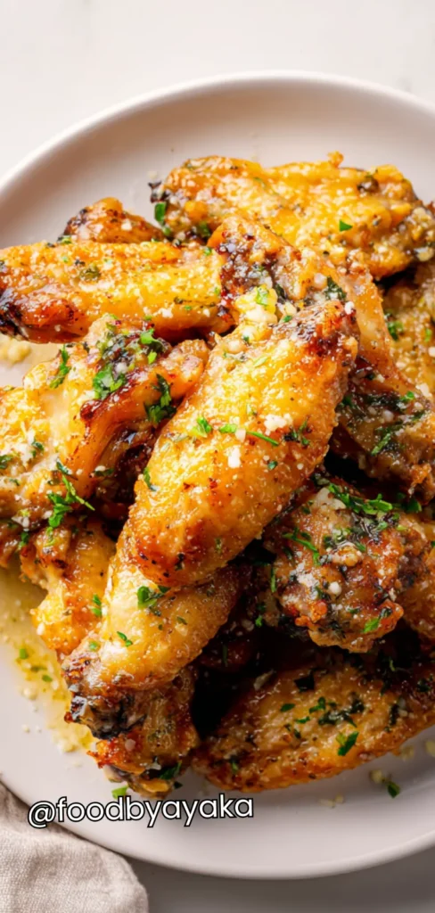 I have always struggled with making wings that stay crispy. I use a little cornstarch, olive oil, and high oven heat to get that golden texture every single time. Always make sure to toss the wings well with the garlic and Parmesan after baking to ensure every bite is coated with flavor.
