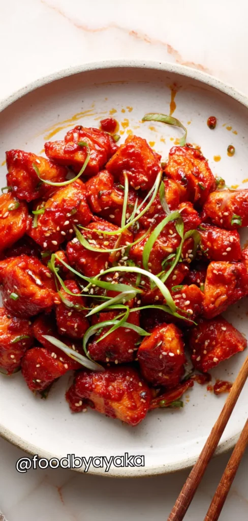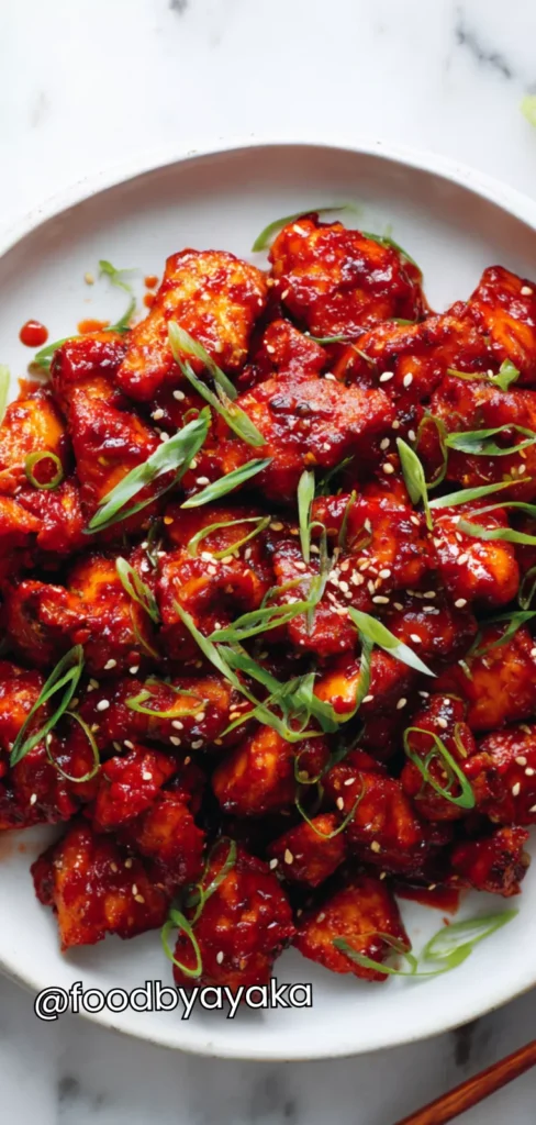 Add the sauce: Reduce the heat to medium. Pour the prepared gochujang sauce over the chicken, stirring gently to coat every piece evenly. Add the water to the skillet to loosen the sauce and help it simmer evenly. As the sauce heats, it will begin to bubble and thicken, clinging to the chicken and creating a deep red, glossy coating.