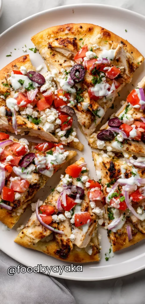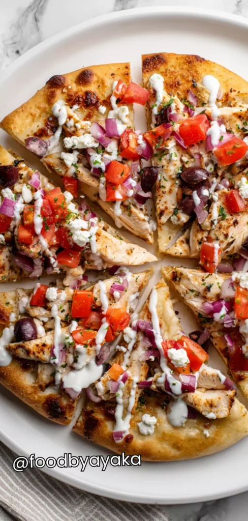 Assemble the flatbread: Spread a generous layer of tzatziki sauce on each warm flatbread. Evenly distribute the cooked chicken over the top. Sprinkle feta cheese, cherry tomatoes, red onion, and Kalamata olives across the flatbread.