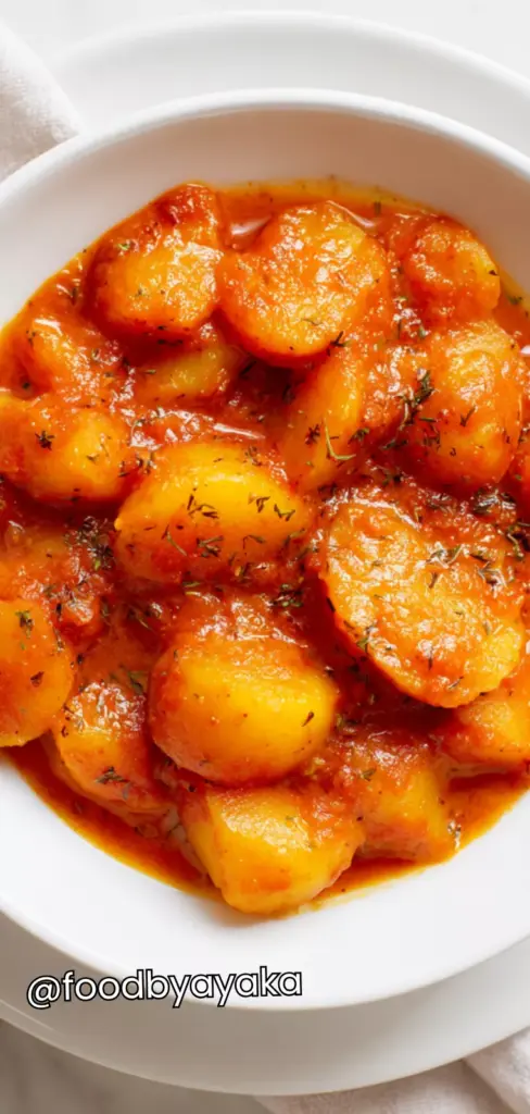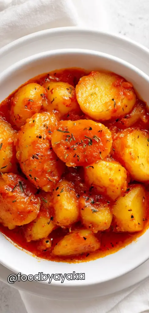 It is a traditional Mediterranean recipe that highlights the natural flavor of potatoes simmered slowly in a rich tomato-based sauce infused with olive oil, garlic, and herbs. The slow cooking process allows the potatoes to absorb the savory sauce, creating a soft, melt-in-your-mouth texture with a hearty and satisfying finish.