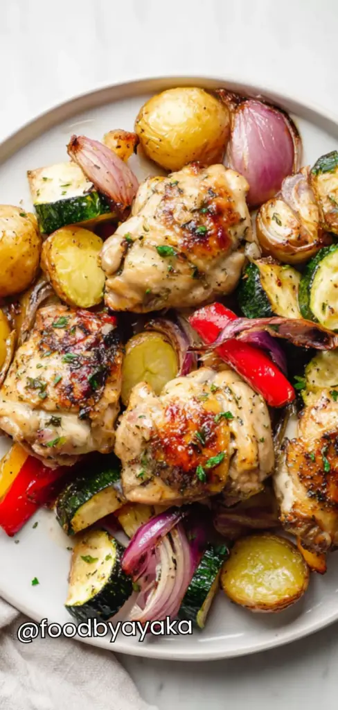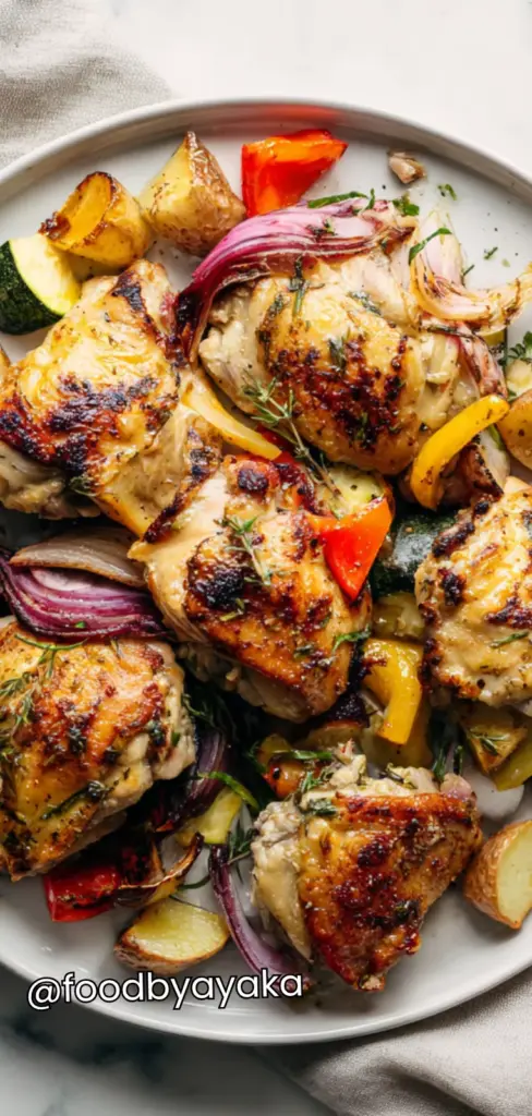 This recipe is inspired by traditional Greek home cooking, where fresh ingredients and simple seasoning are always the star. The chicken becomes tender inside while the skin turns golden and slightly crispy outside. The vegetables soften and caramelize, absorbing all the delicious marinade from the chicken. It’s wholesome, comforting, and perfect for sharing with family.