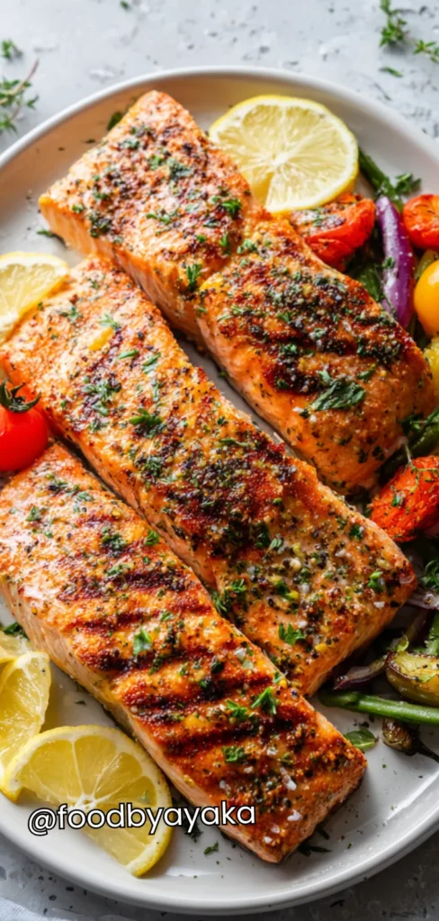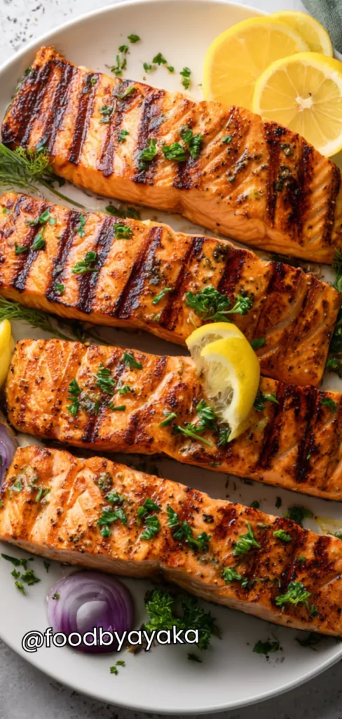 Serve: Transfer the grilled salmon to a serving platter. Garnish with lemon slices and freshly chopped parsley for a bright, fresh presentation. Serve immediately with your choice of sides, such as roasted vegetables, garlic mashed potatoes, or a crisp garden salad. A light drizzle of extra virgin olive oil or a squeeze of fresh lemon juice enhances the flavor just before serving.