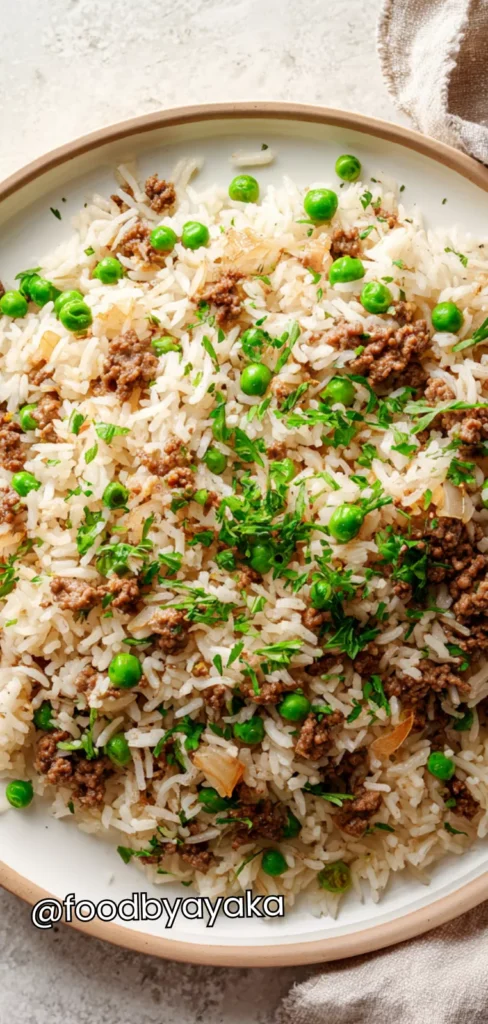 I like to serve ground beef rice and peas hot and fresh, straight from the pot, because that is when the flavors are at their best. I usually pair it with a simple green salad made with lettuce, cucumber, and a light dressing. The freshness of the salad balances the richness of the beef and rice, making the meal feel complete without being heavy.