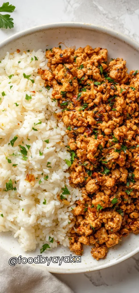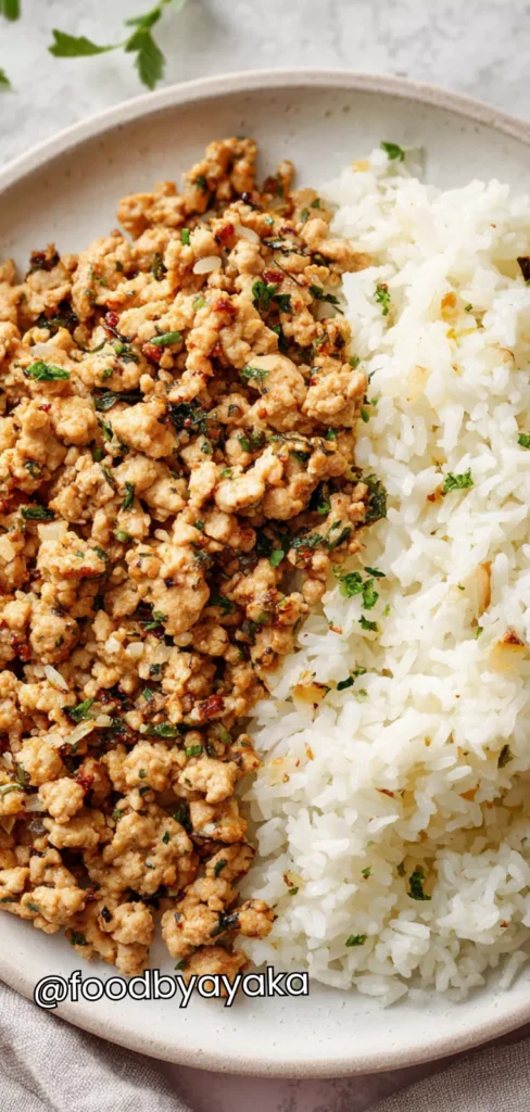 I like serving this dish fresh and warm, right after cooking, when the garlic butter aroma is still strong and comforting. I usually spoon the fluffy rice onto the plate first and gently place the ground turkey on top. This allows the juices from the turkey to soak into the rice, making every bite soft, rich, and full of flavor without needing extra sauce.