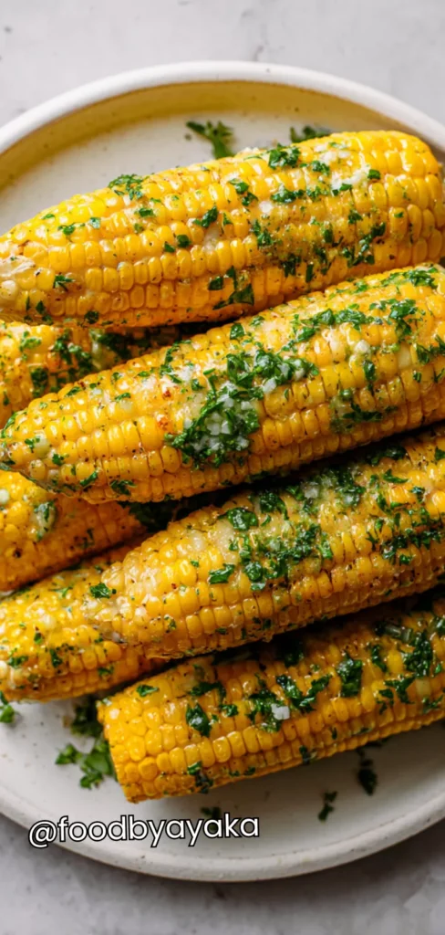 - Finish and serve: Place the buttered corn on a serving platter. Sprinkle with a pinch of paprika or chili flakes if using, and add a little extra chopped herbs on top for a fresh look. Serve immediately while warm for the best flavor and texture.