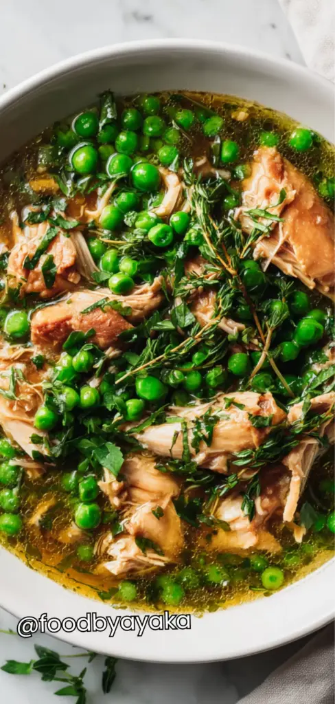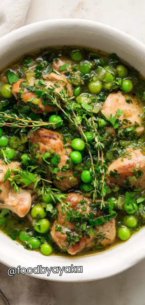 I like to serve this stew straight from the pot for a cozy, family-style meal. I make sure to ladle generous portions into warm bowls so that every bite has a bit of chicken, vegetables, and broth. Sprinkling fresh parsley on top adds color and a subtle freshness that brightens the rich, herby flavors. I also like to squeeze a little lemon juice over each bowl to lift the flavors—it really makes the peas taste sweeter and more vibrant.