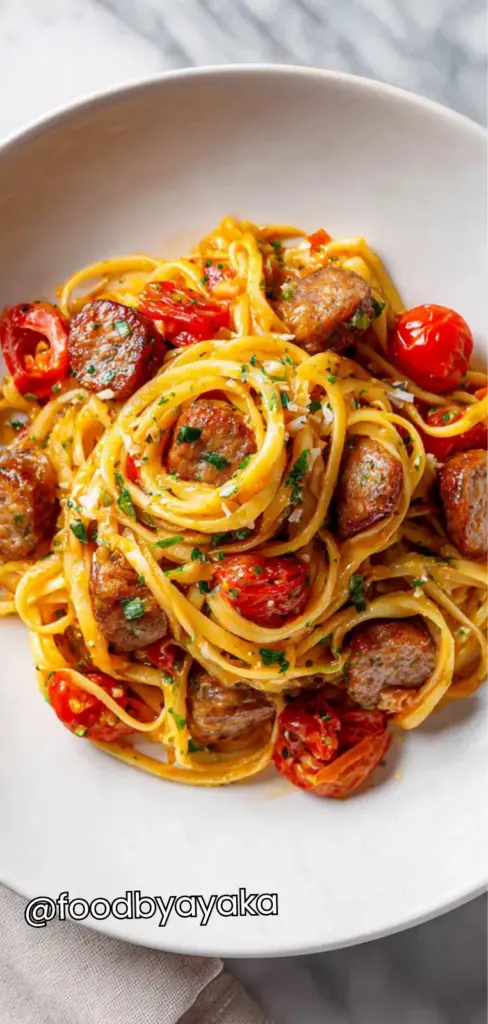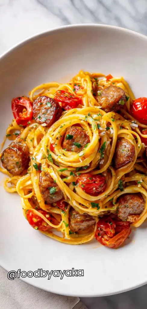 I like to serve this pasta hot straight from the pot because it tastes best when freshly cooked and creamy. The sauce is at its perfect consistency right after cooking, and the flavors are most vibrant at this stage. I usually transfer it into a large serving bowl or individual plates, making sure each portion has a good mix of sausage, pasta, and sauce. For presentation, I add a light sprinkle of Parmesan cheese and a few fresh basil leaves on top, which adds color, aroma, and an extra layer of flavor.