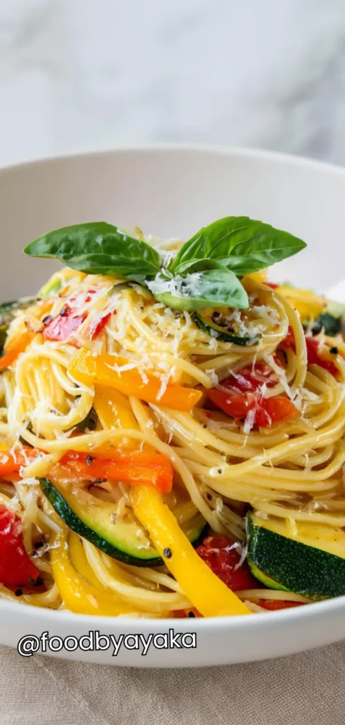 It’s bright, colorful, and packed with fresh vegetables that make every bite a little celebration. The combination of tender pasta and lightly sautéed veggies coated in a flavorful olive oil and garlic sauce makes this dish comforting but not heavy. What I love most is how easy it is to make and how it can be customized to include any vegetables you have on hand.