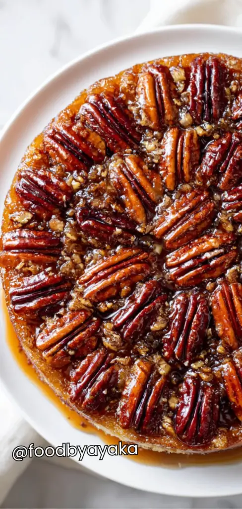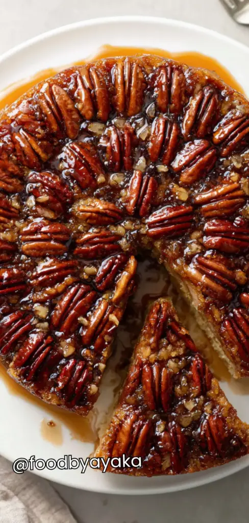 Invert and serve: After cooling slightly, run a knife gently around the edges of the pan to loosen the cake. Place a serving plate over the pan and carefully invert the cake onto the plate in one smooth motion. Lift the pan slowly to reveal the caramelized pecan topping. Allow the cake to cool further before slicing. Serve warm or at room temperature for the best flavor and texture.