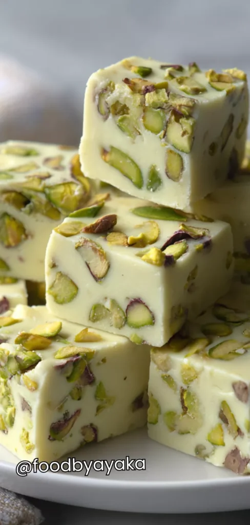 I have made many fudge recipes, but this one stands out because it’s simple, quick, and doesn’t require complicated techniques. I use high-quality white chocolate chips, fresh shelled pistachios, and real butter to ensure the flavor is rich and creamy. Always make sure to stir slowly while melting, as this prevents the fudge from becoming grainy and keeps it silky smooth.