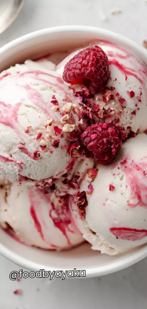 I like serving this ice cream straight from the freezer for a refreshing treat. Scooping it into small bowls and adding fresh raspberries on top makes it look like a dessert from a café. The natural pink color of the raspberries is beautiful and appetizing, so even a simple serving looks special. You can also sprinkle a little granola or crushed nuts to add texture and a bit of crunch with every bite.