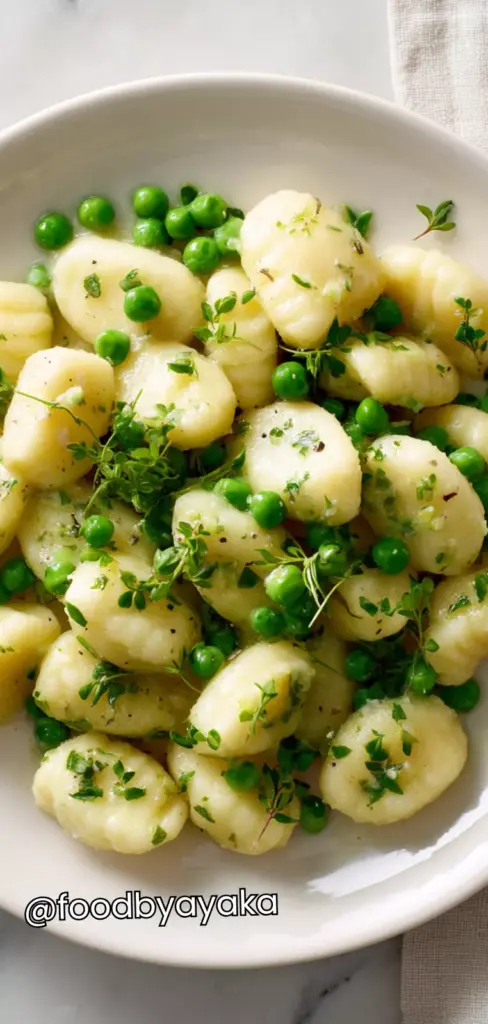 I also enjoy pairing it with a fresh, crisp salad like baby spinach or arugula, lightly dressed with a lemon vinaigrette. The freshness and acidity of the greens balance out the richness of the butter sauce, while the sweet peas in the gnocchi provide little bursts of flavor. For a more substantial meal, I sometimes serve it alongside roasted chicken, seared fish, or even a simple pan-fried sausage. The gnocchi works beautifully as either a main dish or a hearty side.