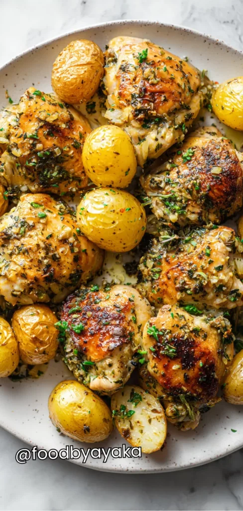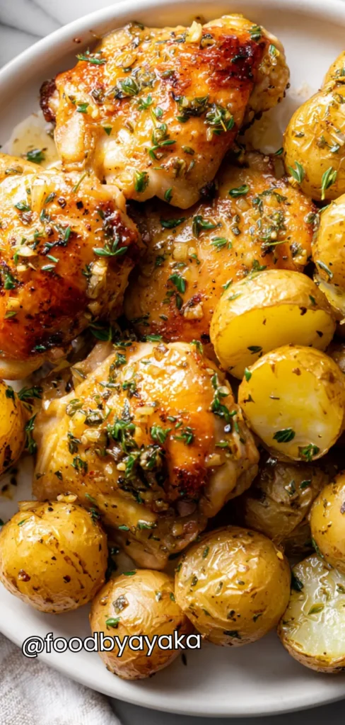 Making these chicken thighs with potatoes is easy, but achieving that perfect golden crust on the chicken while keeping the potatoes soft inside is where the magic happens.This Sheet-Pan Garlic Butter Chicken and Potatoes recipe is one of those dishes. Juicy chicken roasted with golden, tender potatoes, all coated in a rich garlic butter sauce—it’s simple, comforting, and totally satisfying. In this recipe, the garlic butter acts like a flavor hug, making each bite irresistible and leaving your kitchen smelling amazing.