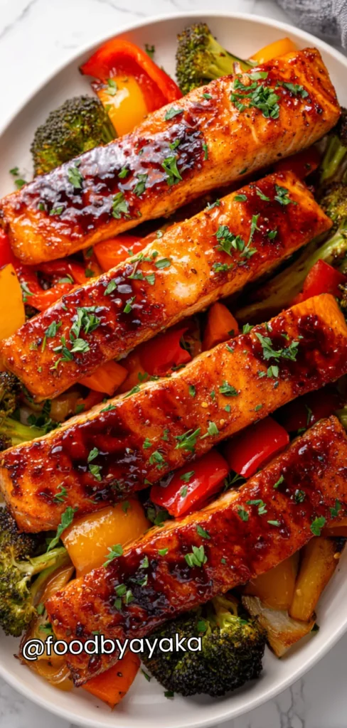 This recipe is naturally healthy because it uses whole ingredients like salmon, fresh vegetables, and a homemade sauce without heavy creams or frying. Salmon provides protein and healthy fats that support heart health and help you feel full longer.