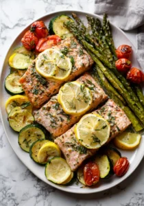 This recipe is naturally healthy because it uses whole ingredients like salmon, fresh vegetables, and a homemade sauce without heavy creams or frying. Salmon provides protein and healthy fats that support heart health and help you feel full longer.