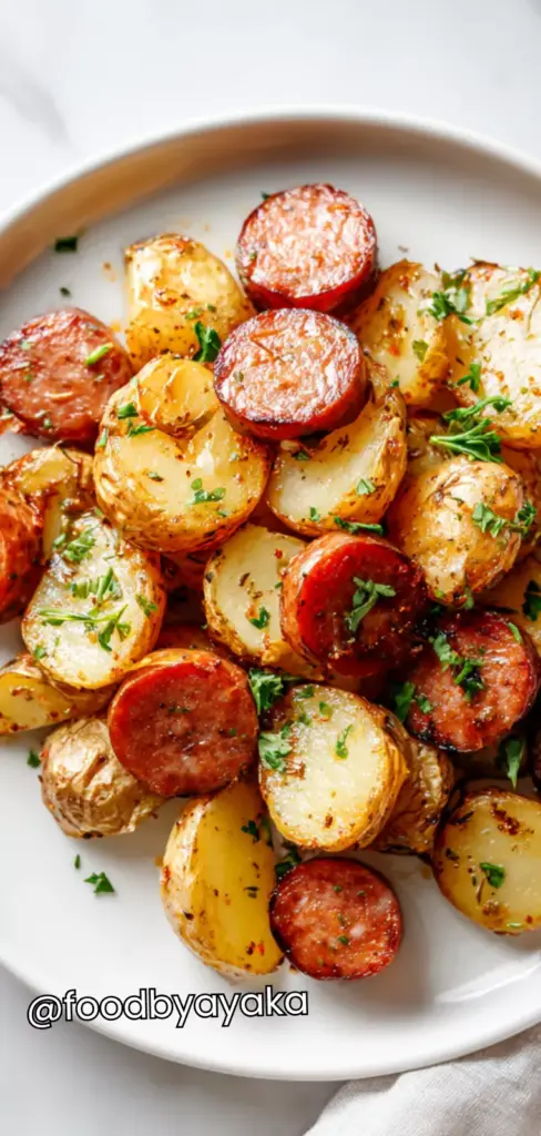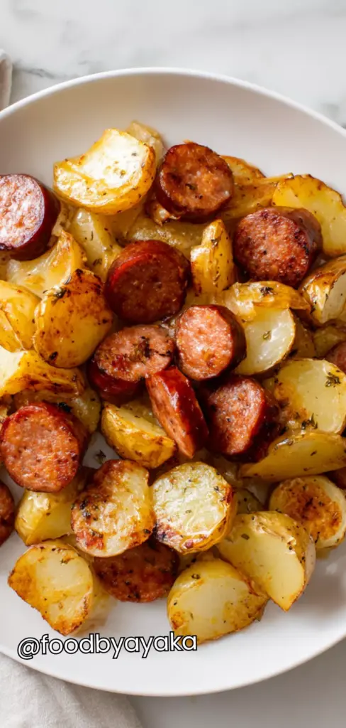 I have always preferred recipes that use everyday pantry ingredients, and I use fresh garlic, good-quality smoked sausage, and baby potatoes always because they create the best texture and flavor combination. The natural oils from the sausage enhance the dish without needing too many extra ingredients, and the herbs add just the right aromatic touch.