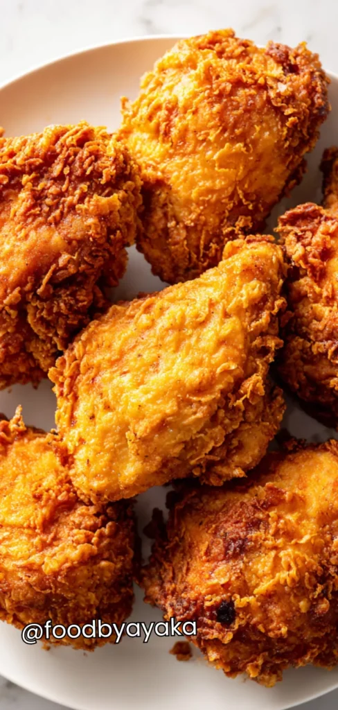 Fry the chicken. Carefully place the chicken pieces into the hot oil, working in batches to avoid overcrowding. Fry for 12–15 minutes per batch, turning occasionally, until the coating is deep golden brown and crispy. Use a thermometer to ensure the internal temperature reaches 165°F (74°C).