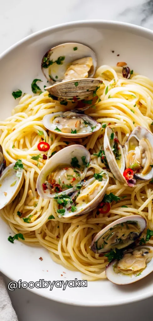 I like to serve Spaghetti alle Vongole immediately after cooking because the flavors are at their freshest. I usually plate it in shallow bowls so each clam sits on top, and the sauce evenly coats the pasta. A light drizzle of extra virgin olive oil over the top gives it shine and richness, making it visually appealing and inviting to eat.