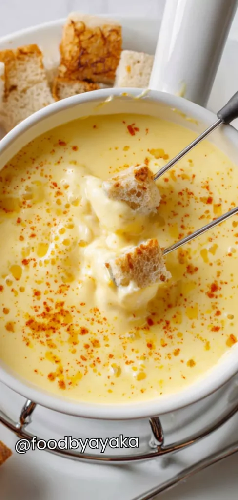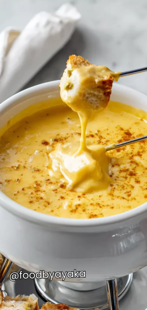 I have tried many cheese fondues over the years, and I use a combination of sharp cheddar and Gruyère because it melts beautifully and has that classic cheesy flavor. Always make sure to whisk slowly while adding the cheese, so it stays smooth and glossy. The fondue can be made slightly ahead of time and reheated gently, making it easy to serve when guests arrive.