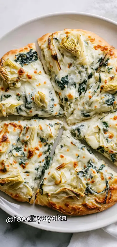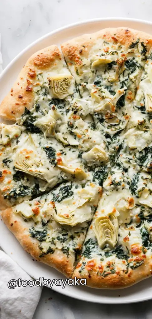 minutesCreamy spinach artichoke pizza with a cheesy, garlicky topping and crispy crust. An easy, comforting homemade recipe perfect for dinner, gatherings, or meatless meals.