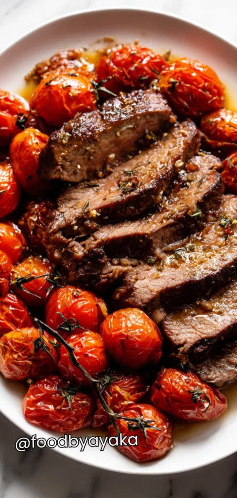 I love serving this dish straight from the skillet because it feels warm, inviting, and rustic. Placing the sliced steak on top of the caramelized cherry tomatoes makes the meal visually appealing and lets the tomato juices mingle with the meat naturally. Drizzling a little of the pan sauce over the slices adds extra flavor and keeps each bite juicy and tender.