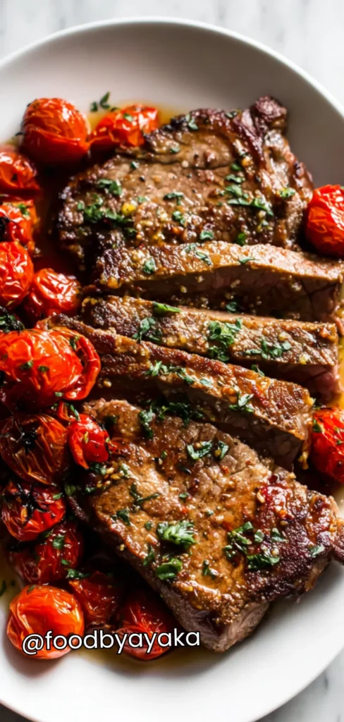 - Combine and serve: Slice the rested steak against the grain into thick, juicy pieces. Arrange the steak slices back into the skillet with the cooked cherry tomatoes, spooning some of the pan juices over the meat for extra flavor. Garnish with fresh parsley or basil leaves for color and freshness.