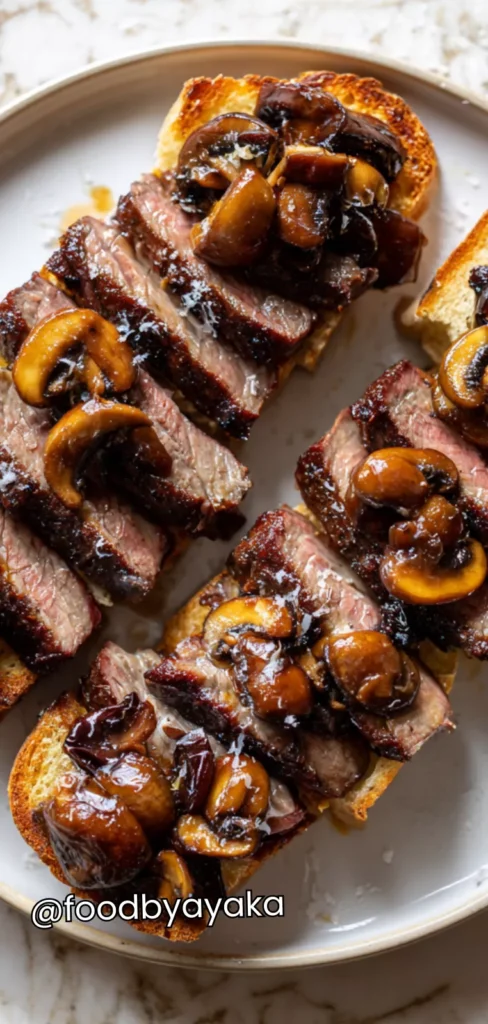 - Assemble the plate: Place the toasted bread on serving plates. Pile sautéed mushrooms on top of the toast, then layer slices of steak over the mushrooms. Drizzle any remaining pan juices over the top for extra flavor.