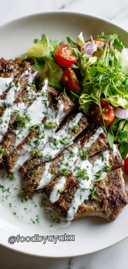What makes this recipe special for me is the contrast of temperatures and textures. The warm steak, the cool yogurt sauce, and the crisp salad work together beautifully without overpowering each other. It’s a meal that feels nourishing and satisfying, not heavy or complicated. Every element has a purpose, and nothing feels extra or unnecessary.