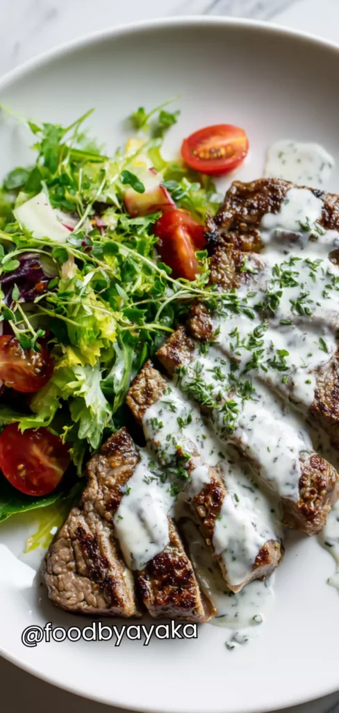 minutesJuicy Steak with Garlic Yogurt Sauce and Fresh Salad, an easy and healthy main dish perfect for weeknight dinners, date nights, and balanced meals at home.