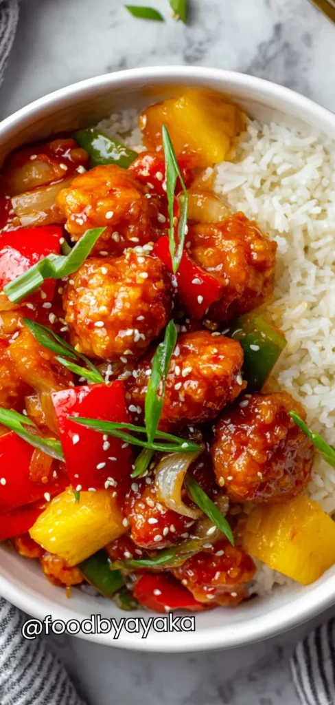 minutesEnjoy a tropical twist on a takeout classic with this Sweet and Sour Chicken Pineapple Bowl—crispy chicken tossed in tangy-sweet sauce with bell peppers and pineapple, beautifully served in a pineapple half.