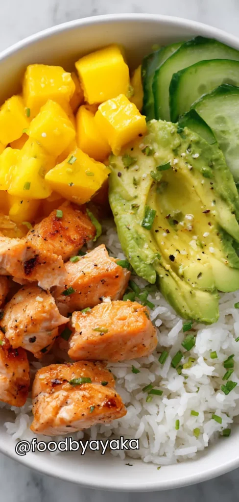 This rice bowl is very healthy because it combines lean protein, fresh fruits, and vegetables in one meal. Salmon is rich in omega-3 fatty acids, which support heart health and brain function.