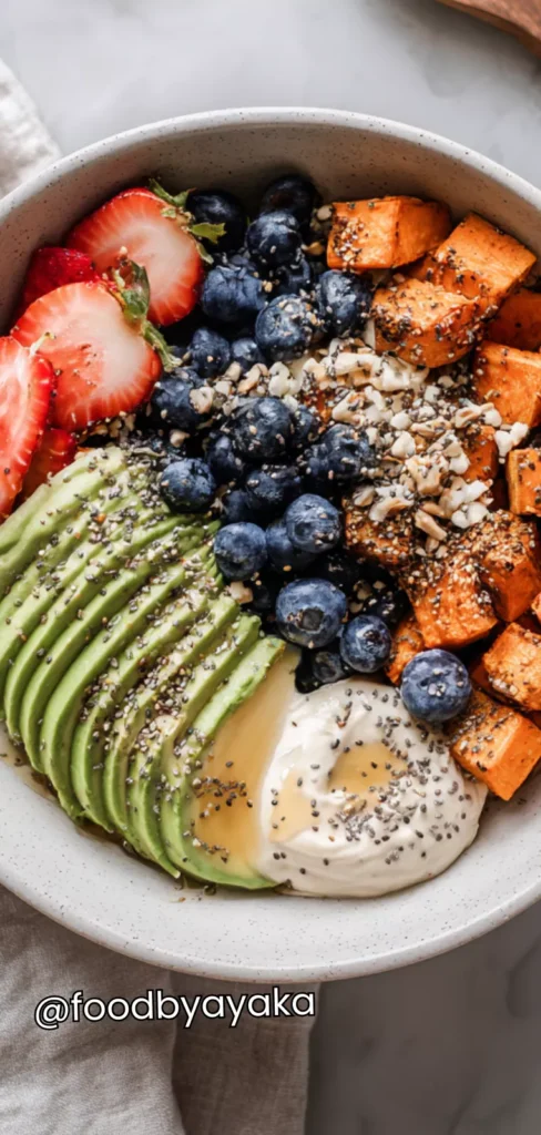 I have tried many breakfast bowls before, but I use roasted sweet potatoes as the base every time now. Always toss them in a little olive oil, cinnamon, nutmeg, and a pinch of salt before roasting—it brings out their natural sweetness perfectly. The eggs are essential, whether poached, fried, or scrambled, because they add protein and richness. Always top with avocado and seeds; they’re small touches but they transform the dish.