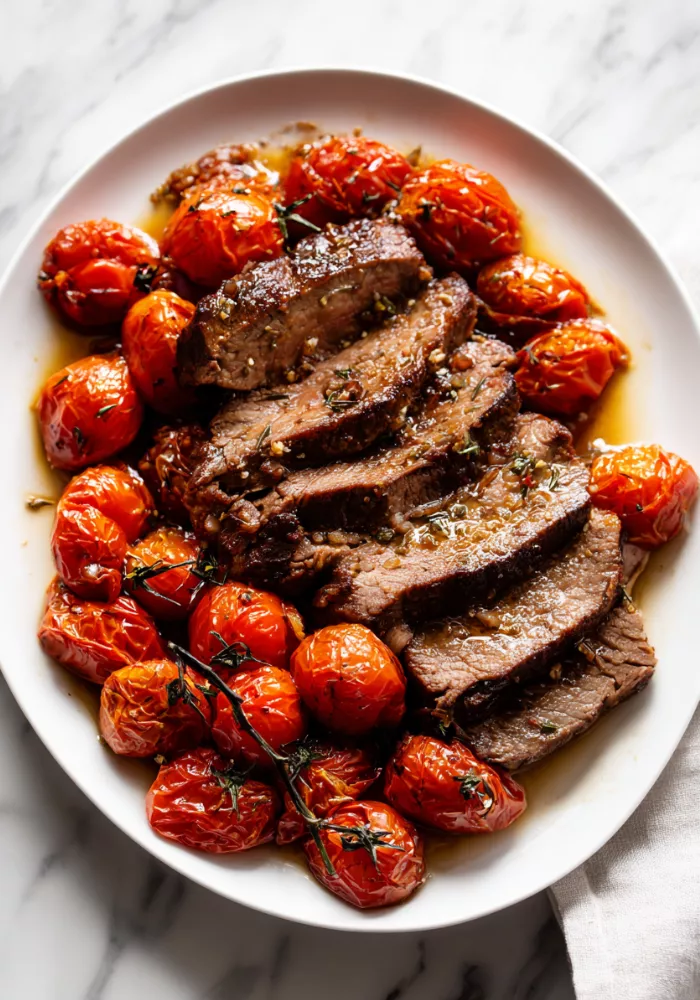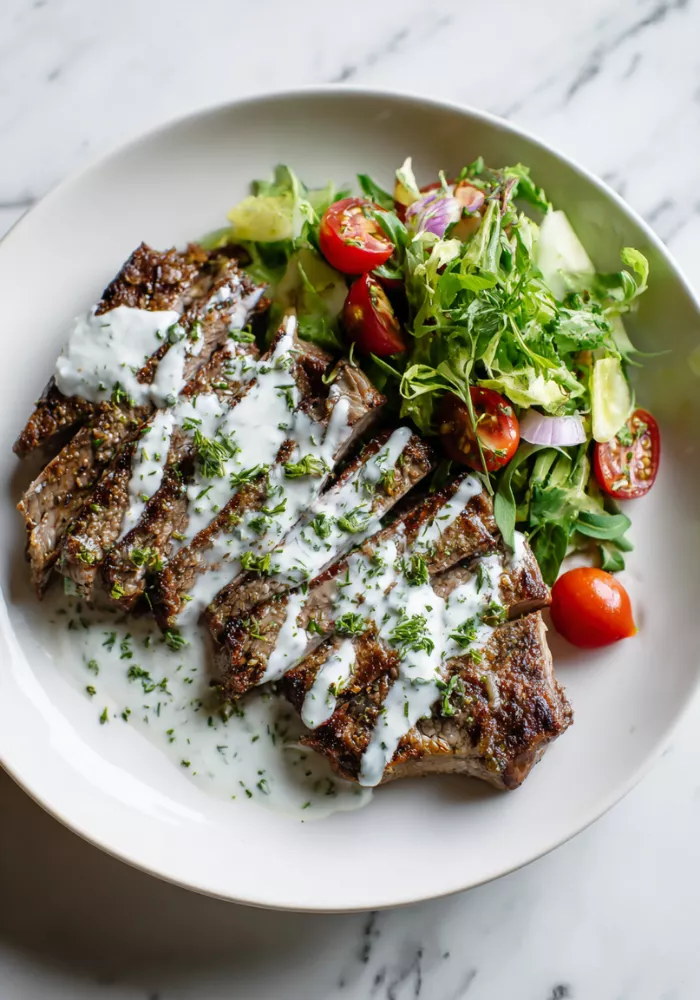 Steak with Garlic Yogurt Sauce and Fresh Salad Recipe