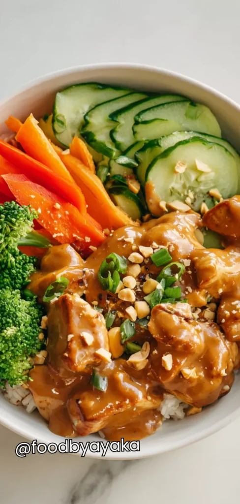 I like to serve this bowl immediately after cooking because the peanut sauce tastes best warm. First, I place a scoop of fluffy jasmine rice at the bottom of a wide bowl. Then, I spoon the chicken and vegetable mixture evenly on top so every bite has a little of everything. I always make sure the vegetables stay colorful and slightly crisp—it makes the dish look as good as it tastes.