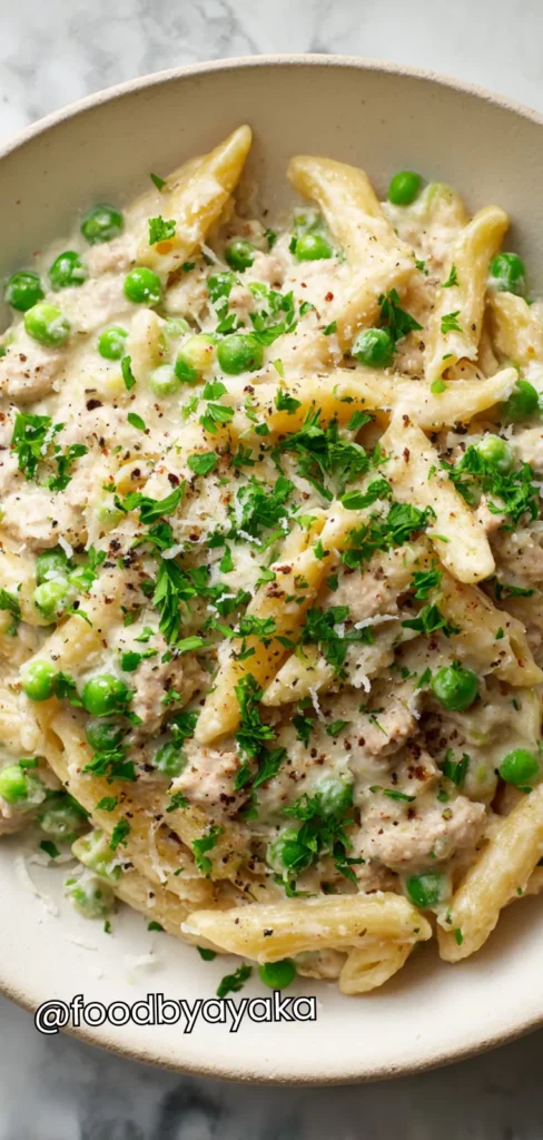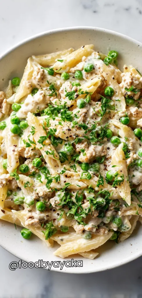 It’s rich, creamy, and packed with protein from turkey, plus the sweetness of peas adds a gentle pop of color and flavor. The creamy sauce clings perfectly to the pasta, making every bite comforting and satisfying. This recipe is quick enough for a busy evening but still feels homemade and hearty, perfect for families.