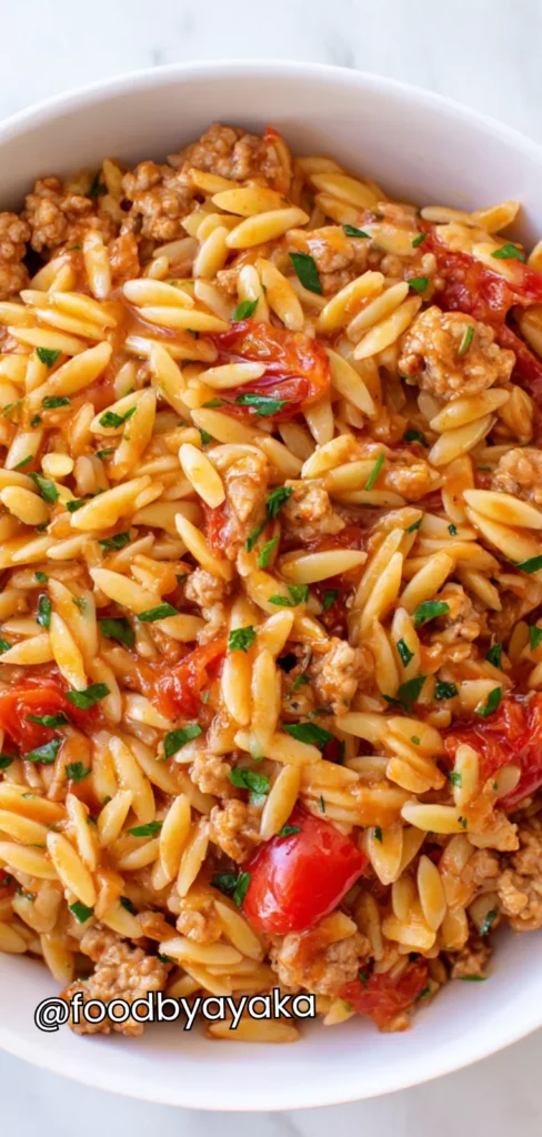 I have always loved recipes that are both simple and versatile. I use ground turkey because it’s lean but still keeps the dish moist. I always make sure to sauté onions and garlic first, which gives a rich base flavor, and then I add herbs and spices gradually, tasting as I go. This method ensures the orzo absorbs all the flavors beautifully and the meal tastes like it simmered all day.