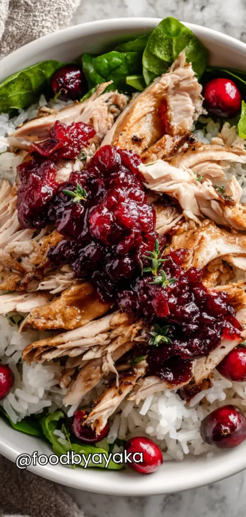 I like to serve this bowl warm straight from the kitchen so that every bite is comforting and aromatic. After layering the rice, turkey, and vegetables, I spoon cranberry sauce generously over the top. The sauce adds not only flavor but also a pop of color that makes the bowl look festive and inviting.