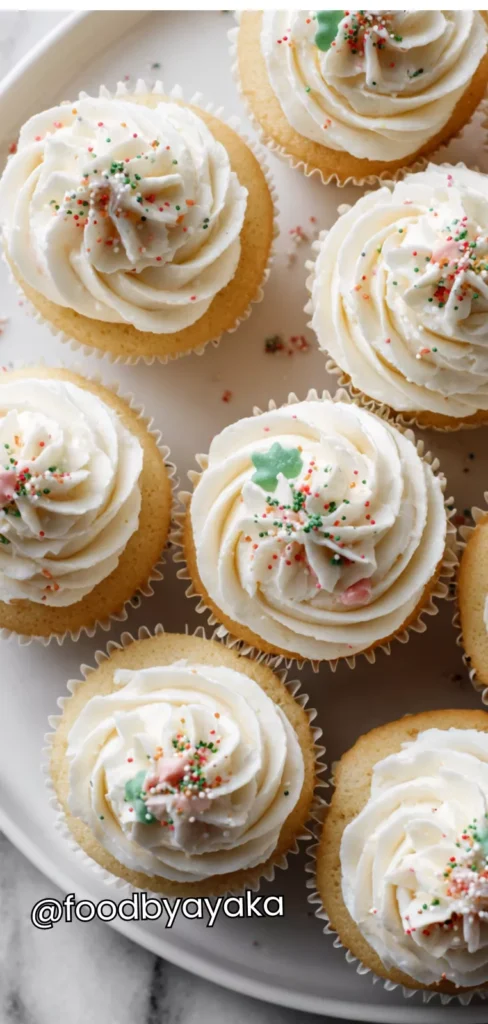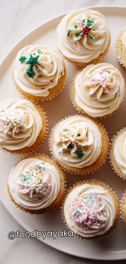 Decorate the cupcakes: Once the cupcakes are completely cool, frost them generously with the vanilla buttercream. Decorate with red and green sprinkles, edible glitter, or mini festive decorations for a cheerful Christmas look.