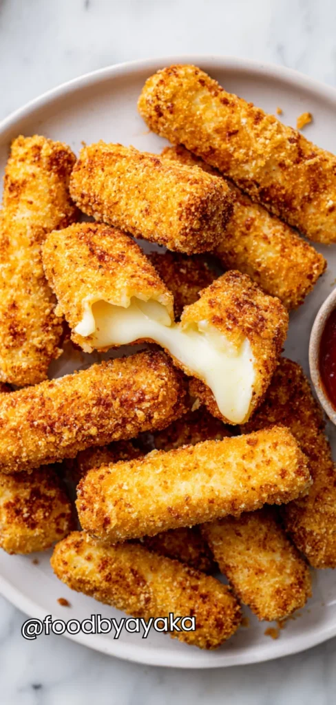 Cook the mozzarella sticks: Frying: Heat oil in a deep skillet or saucepan to 350°F (175°C). Fry sticks in batches for 2–3 minutes, turning carefully, until golden brown and crispy. Drain on paper towels. Baking (Healthier Option): Preheat oven to 425°F (220°C). Line a baking sheet with parchment paper and lightly spray with oil. Arrange frozen sticks in a single layer and bake for 12–15 minutes, flipping halfway through until golden and crispy.